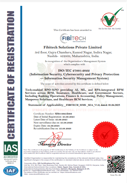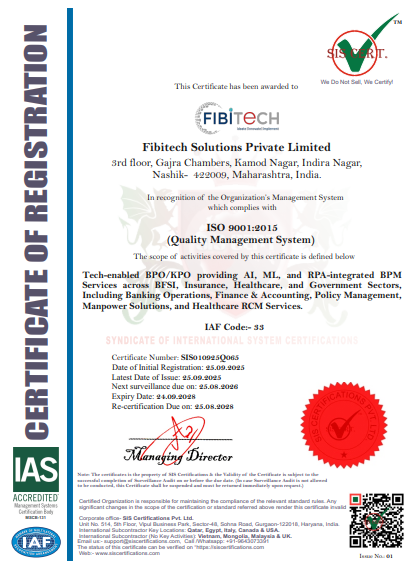 Fibitech Solutions Pvt Ltd is a tech-enabled BPO/KPO startup, revolutionizing BPM with AI, ML, and RPA integrations for BFSI, Manufacturing,and Government sectors.